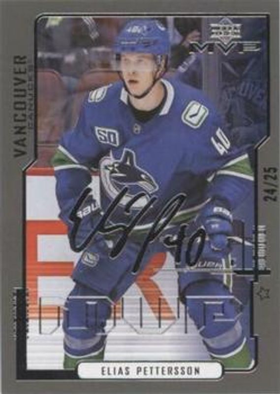 The Elias Pettersson 2020 Upper Deck MVP #14 20th Anniversary First Star /25 card is 1 of 21 Elias Pettersson's card variations in the 2020 Upper Deck MVP set being tracked by Sports Card Investor, including Base, Blue, Gold Script, Silver Script, and Super Script /25.