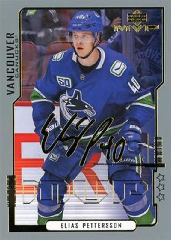 The Elias Pettersson 2020 Upper Deck MVP #14 20th Anniversary Third Star card is 1 of 21 Elias Pettersson's card variations in the 2020 Upper Deck MVP set being tracked by Sports Card Investor, including Base, Blue, Gold Script, Silver Script, and Super Script /25.