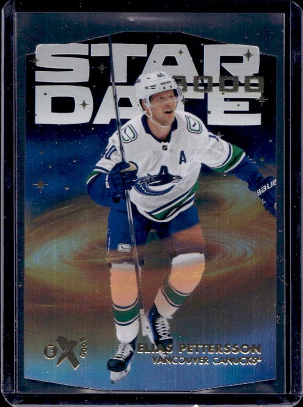 The Elias Pettersson 2023 Skybox E-X 2000 #SD-2 Star Date 3000 card is 1 of 23 Elias Pettersson's card variations in the 2023 Skybox E-X 2000 set being tracked by Sports Card Investor, including Base, All-Access Credentials, Credentials /499, Credentials Blue /299, and Essential Credentials /99.