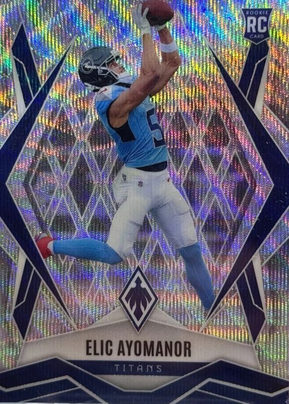 This card is 1 of 76 Elic Ayomanor's card variations in the 2025 Phoenix set being tracked by Sports Card Investor, including Base, Silver, Red Hyper /399, Red Winter /399, and Light Blue Pyramids /385.