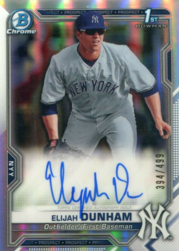 This card is 1 of 2 Elijah Dunham's card variations in the 2021 Bowman Chrome set being tracked by Sports Card Investor, including Prospect Auto (1st).