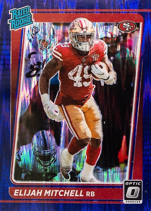 This card is 1 of 34 Elijah Mitchell's card variations in the 2021 Optic set being tracked by Sports Card Investor, including Base, Blue Hyper, Blue Scope, Bronze, and Green Velocity.