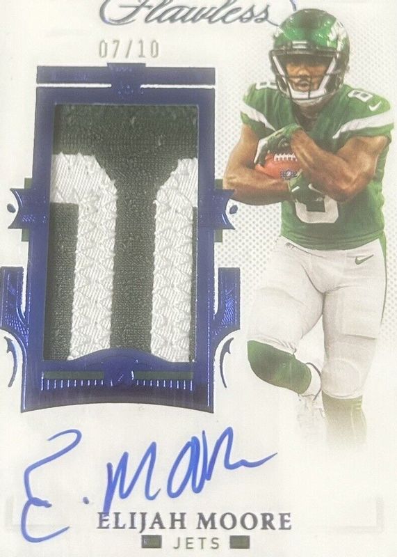 The Elijah Moore 2021 Flawless #RPA-EMO Rookie Patch Auto - Sapphire (/10) card in Raw condition has not changed in price in the last 30 days and was last sold for $152.50 .