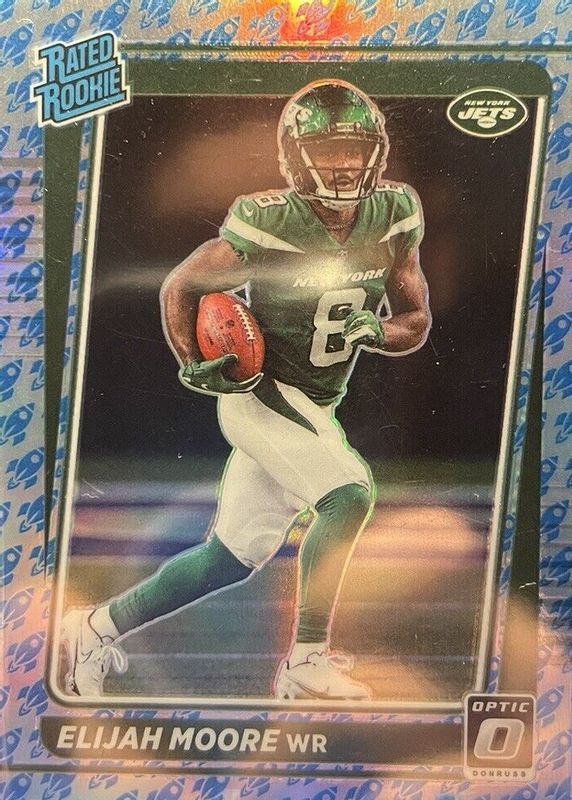 This card is 1 of 58 Elijah Moore's card variations in the 2021 Optic set being tracked by Sports Card Investor, including Base, Blue Hyper, Blue Scope, Bronze, and Green Velocity.