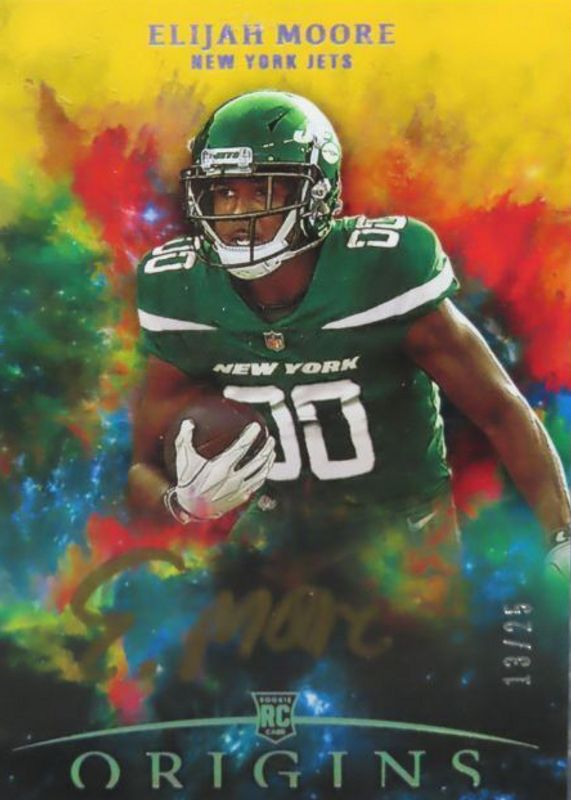 This card is 1 of 21 Elijah Moore's card variations in the 2021 Origins set being tracked by Sports Card Investor, including Origins Autographs - Silver Ink (/49), Rookie Autographs, Rookie Jumbo Jersey Autographs, Rookie Autographs - Red /99, and Rookie Jumbo Jersey Autographs - Red /99.