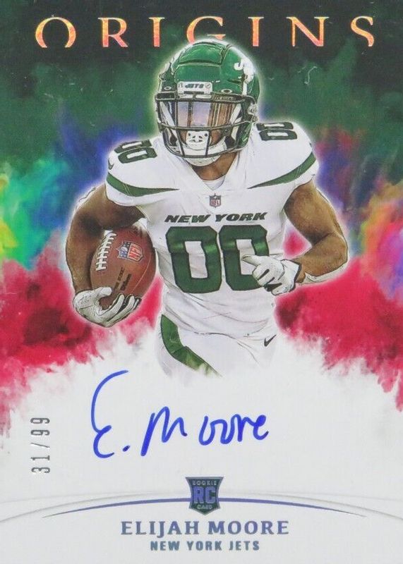 This card is 1 of 21 Elijah Moore's card variations in the 2021 Origins set being tracked by Sports Card Investor, including Origins Autographs - Gold Ink (/25), Origins Autographs - Silver Ink (/49), Rookie Autographs, Rookie Jumbo Jersey Autographs, and Rookie Jumbo Jersey Autographs - Red /99.