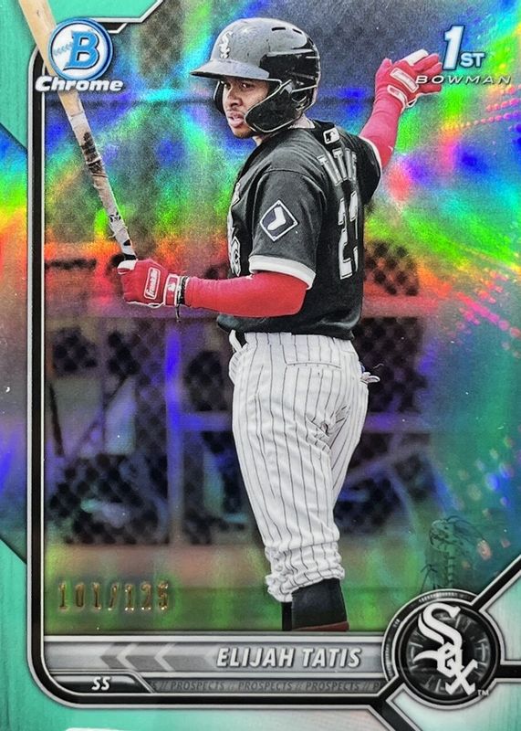 This card is 1 of 25 Elijah Tatis' card variations in the 2022 Bowman set being tracked by Sports Card Investor, including Chrome Prospects (1st), Chrome Prospects - Refractor /499 (1st), Chrome Prospects - Lava Refractor /399 (1st), Chrome Prospects - Speckle Refractor /299 (1st), and Chrome Prospects - Purple RayWave Refractor /250 (1st).