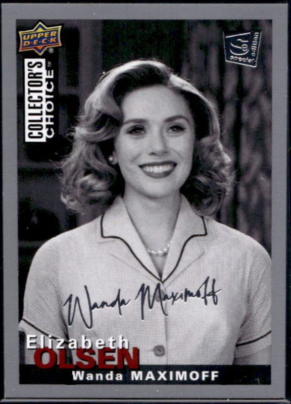 The Elizabeth Olsen as Wanda Maximoff 2024 Upper Deck Marvel Studios Series 1 #CC-2 1995 Collectors Choice SE Retros - Silver Scripts /100 card is 1 of 33 Elizabeth Olsen as Wanda Maximoff's card variations in the 2024 Upper Deck Marvel Studios Series 1 set being tracked by Sports Card Investor, including #1 Base, #9 Base, #12 Base, #1 Exclusives /100, and #12 Exclusives /100.