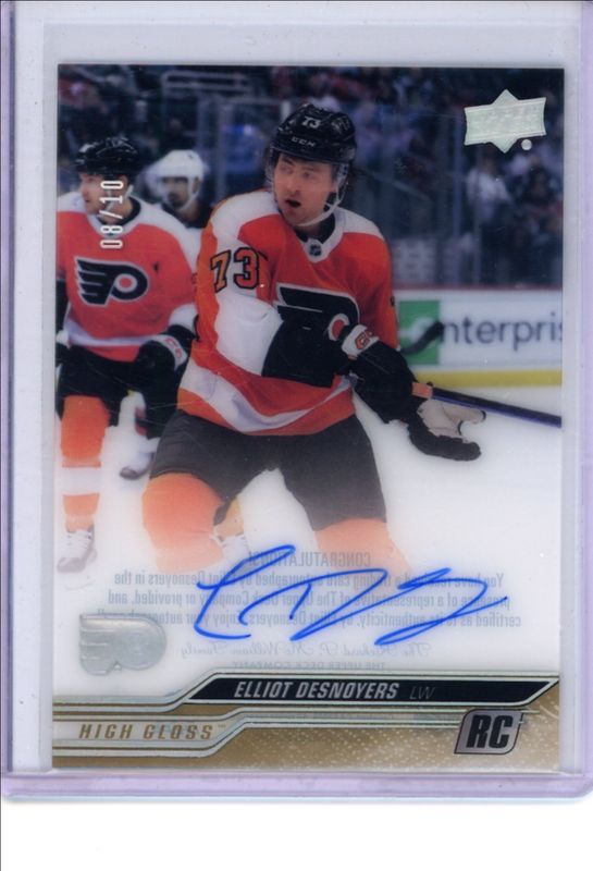 The Elliot Desnoyers 2023 Upper Deck Clear Cut #CC-ED High Gloss /10 Rookie card is 1 of 4 Elliot Desnoyers' card variations in the 2023 Upper Deck Clear Cut set being tracked by Sports Card Investor, including Base, Outburst /25, and Outburst Gold /1.