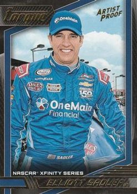 The Elliott Sadler 2017 Torque NASCAR #38 Artist Proof /75 card is 1 of 33 Elliott Sadler's card variations in the 2017 Torque NASCAR set being tracked by Sports Card Investor, including Base, Gold, Blue /150, Red /100, and Purple /50.