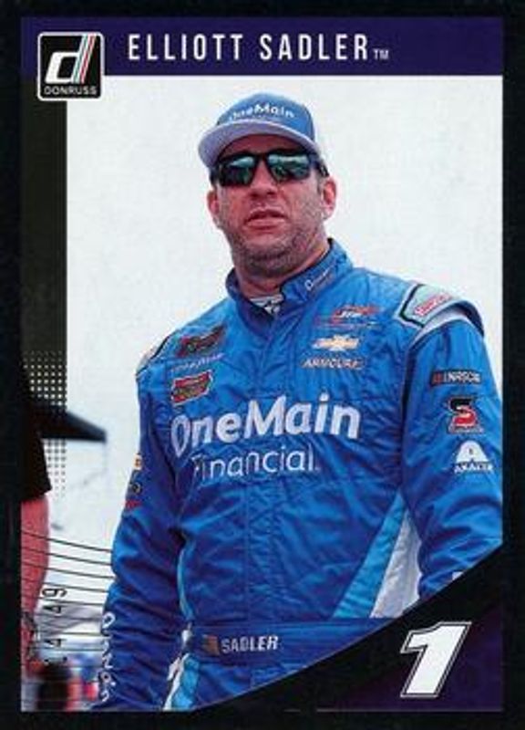 The Elliott Sadler 2019 Donruss NASCAR #67 Press Proof /49 card is 1 of 33 Elliott Sadler's card variations in the 2019 Donruss NASCAR set being tracked by Sports Card Investor, including #67 Silver, #143 Silver, #67 Gold /299, #67 Black /199, and #67 Gold Press Proof /99.