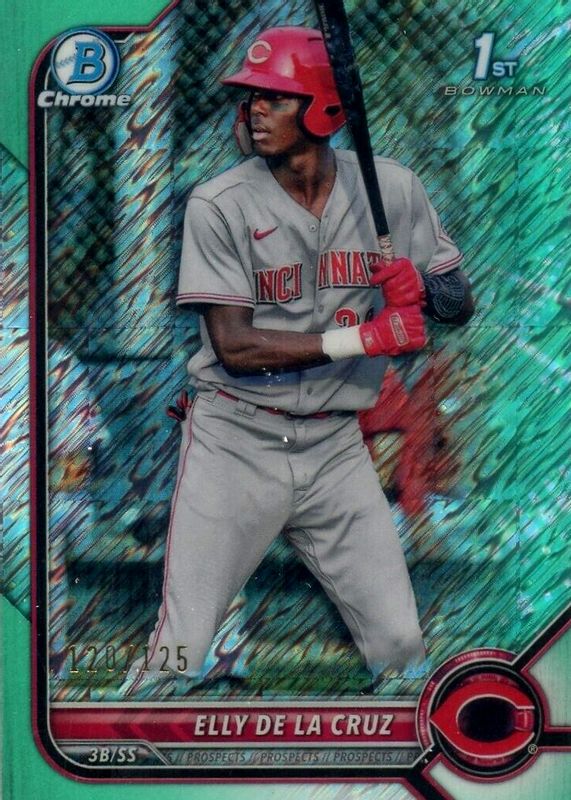 The Elly De La Cruz 2022 Bowman #BCP-50 Chrome Prospects - Aqua Shimmer Refractor /125 (1st) card in Raw condition has not changed in price in the last 30 days and was last sold for $64.00 .
