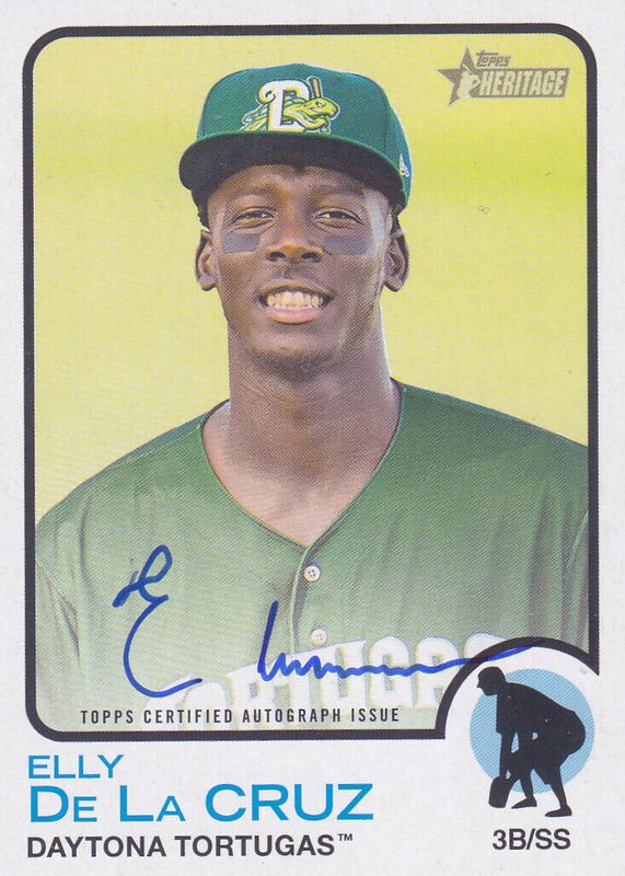 This card is 1 of 3 Elly De La Cruz's card variations in the 2022 Topps Heritage Minor League set being tracked by Sports Card Investor, including Base SP, and 1973 Topps Pack Cover.