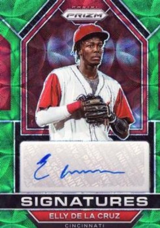 The Elly De La Cruz 2023 Prizm #SIG-EC Signatures - Green Scope /75 card is 1 of 89 Elly De La Cruz's card variations in the 2023 Prizm set being tracked by Sports Card Investor, including Base, Blue Ice, Giraffe, Green Ice, and Hyper.