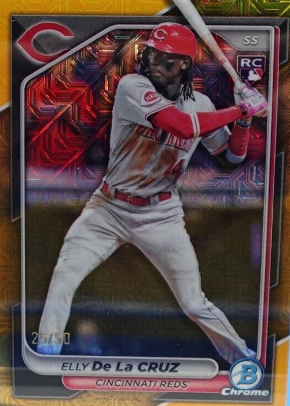 Best Prices Available For Sale of Elly De La Cruz 2024 Bowman Chrome Mega Box #42 Gold Mojo Refractor /50