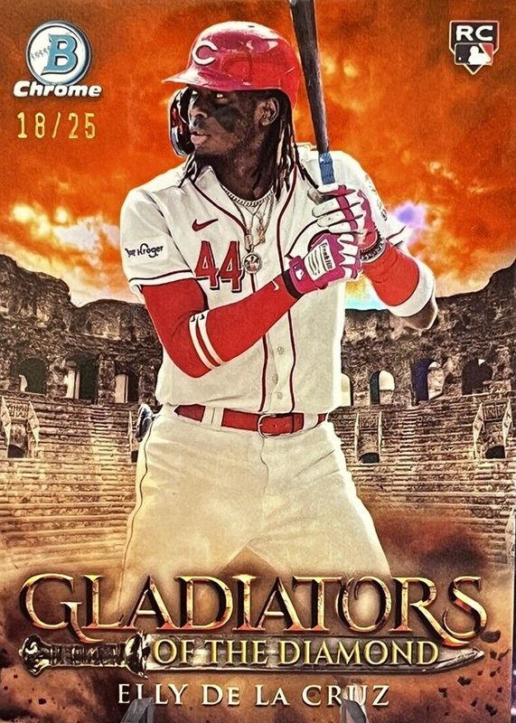 The Elly De La Cruz 2024 Bowman #GOTD-1 Gladiators of the Diamond - Orange Refractor /25 Rookie card in Raw condition has not changed in price in the last 30 days and was last sold for $400.00 .