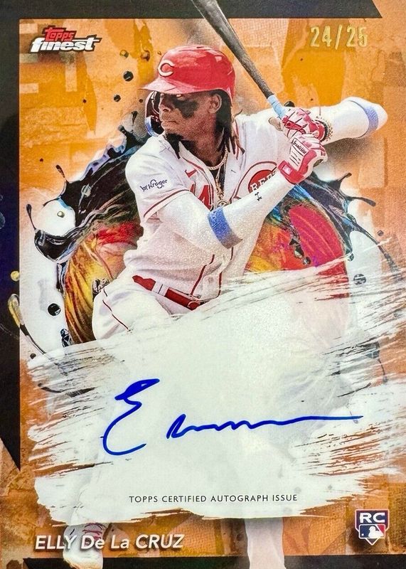 The Elly De La Cruz 2024 Topps Finest #FA-ED Finest Autographs - Orange Refractor /25 Rookie card in Raw condition has not changed in price in the last 30 days and was last sold for $400.00 .