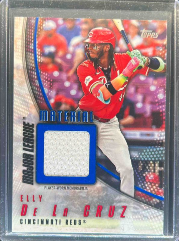The Elly De La Cruz 2025 Topps #MLM2-ED Major League Material Relics (Series 2) - Blue /150 card is 1 of 269 Elly De La Cruz's card variations in the 2025 Topps set being tracked by Sports Card Investor, including #150 Base, #150 Aqua Holo Foil, #150 Diamante Foil, #639 Diamante Foil, and #150 Holo Foil.