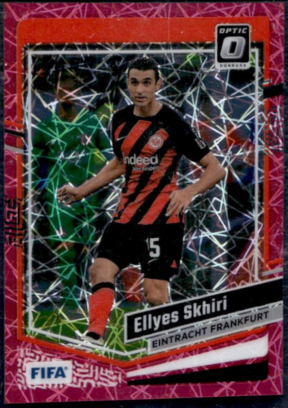 The Ellyes Skhiri 2023 Donruss #146 Optic - Pink Velocity /99 card is 1 of 30 Ellyes Skhiri's card variations in the 2023 Donruss set being tracked by Sports Card Investor, including Base, Optic, Cubic, Diamond, and Optic - Argyle.