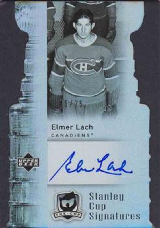 Elmer Lach's Hockey cards are available in at least 43 sets. Elmer Lach's biggest 7-day price movers are 2006 Upper Deck The Cup #CS-LE Stanley Cup Signatures /25, 2010 Upper Deck The Cup #LC-EL Legendary Cuts /1, and 2006 Upper Deck The Cup #HH-EL Hardware Heroes.