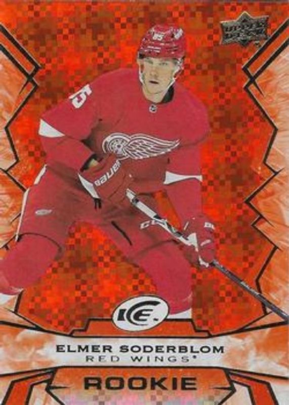 The Elmer Soderblom 2022 Upper Deck Ice #124 Orange Rookie card is 1 of 30 Elmer Soderblom's card variations in the 2022 Upper Deck Ice set being tracked by Sports Card Investor, including #155 Base /1299, #124 Base /1299, #124 Autographs White Snowflake, #124 Gold, and #124 Green.