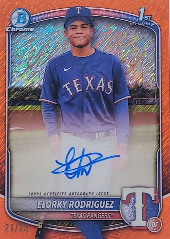 Best Prices Available For Sale of Elorky Rodriguez 2025 Bowman Chrome #CPA-ER Prospect Auto - Orange Shimmer Refractor /25 (1st)