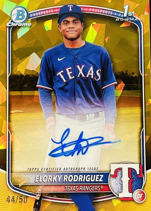 ELORKY RODRIGUEZ 2025 BOWMAN CHROME 1ST SAPPHIRE GOLD RANGERS AUTO /50 Q2754