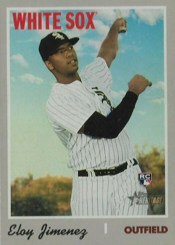 The Eloy Jimenez 2019 Topps Heritage #516 Base Rookie card in Raw condition has moved up $0.26 (+26.3%) in the last 30 days and was last sold for $1.25 .
