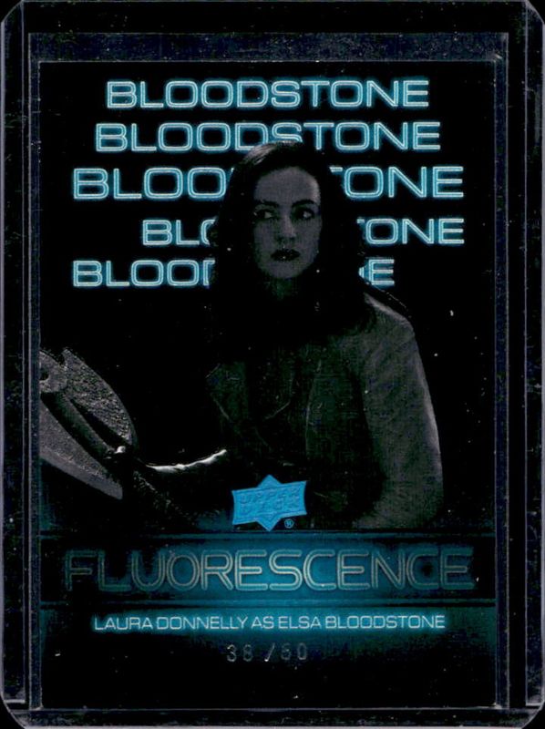 The Elsa Bloodstone 2024 Upper Deck Marvel Studios Series 1 #F-17 Flourescence - Blue /50 card is 1 of 35 Elsa Bloodstone's card variations in the 2024 Upper Deck Marvel Studios Series 1 set being tracked by Sports Card Investor, including 1995 Collectors Choice SE Retros, Dazzlers - Blue, Dazzlers - Green, Dazzlers - Pink, and Flourescence - Red.