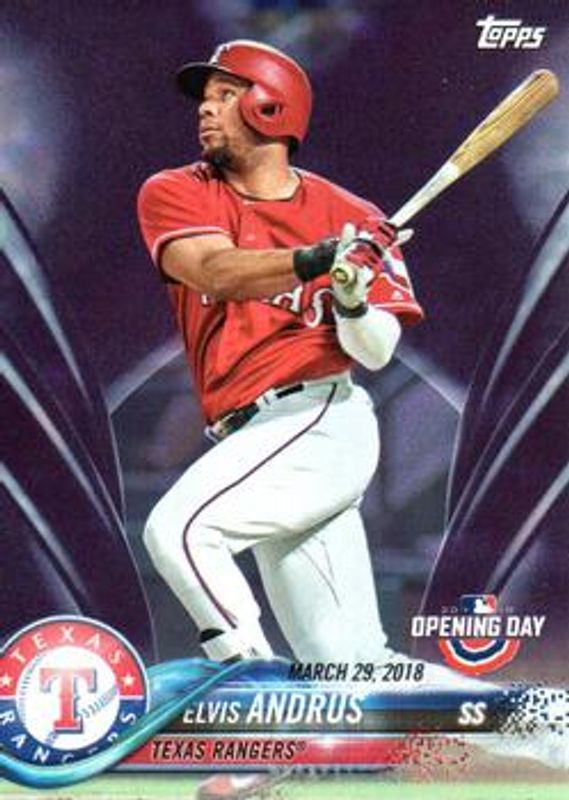 The Elvis Andrus 2018 Topps Opening Day #101 Purple card is 1 of 10 Elvis Andrus' card variations in the 2018 Topps Opening Day set being tracked by Sports Card Investor, including Base, Opening Day Edition Blue Foil, 5x7 /49, 5x7 Gold /10, and Opening Day 1 of 1 /1.