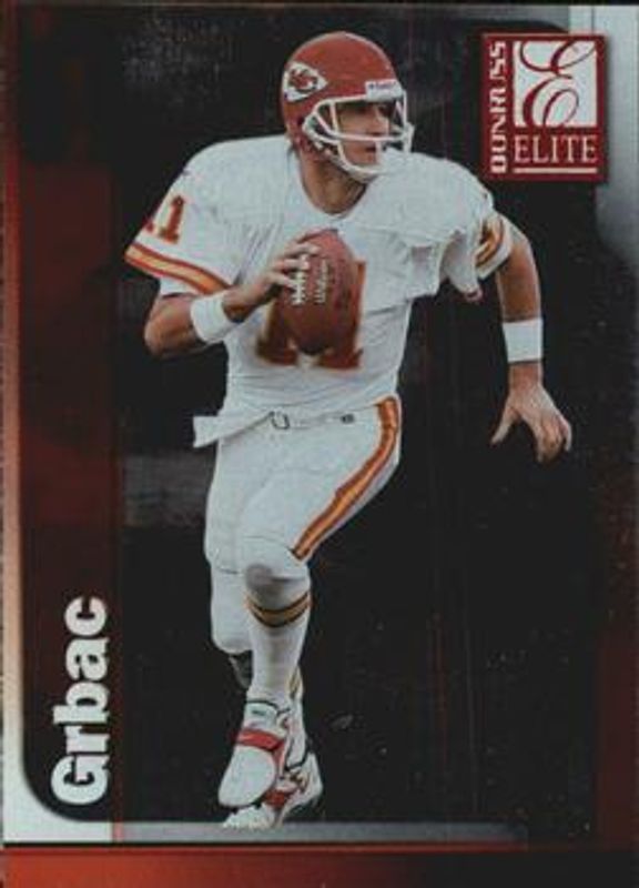 The Elvis Grbac 1999 Donruss Elite #011 Base card is 1 of 3 Elvis Grbac's card variations in the 1999 Donruss Elite set being tracked by Sports Card Investor, including Aspirations /72, and Status /28.