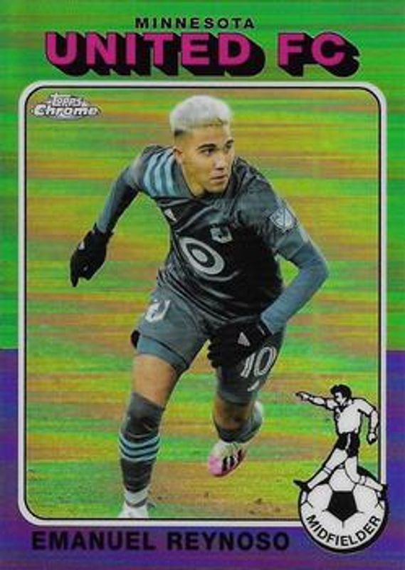 The Emanuel Reynoso 2021 Topps Chrome MLS #TF75-4 1975 Topps Footballers card is 1 of 24 Emanuel Reynoso's card variations in the 2021 Topps Chrome MLS set being tracked by Sports Card Investor, including Base, Celebration FC, Pink X-Fractor, Refractor, and Aqua Refractor /299.
