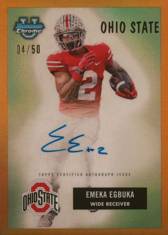 This card is 1 of 25 Emeka Egbuka's card variations in the 2023 Bowman Chrome University set being tracked by Sports Card Investor, including Prospect Auto (1st), Prospect Auto - Refractor /499 (1st), Prospect Auto - Fuchsia Mini-Diamond Refractor /150 (1st), The Big Kahuna Autographs /150, and 1955 Bowman Football Autographs /99.
