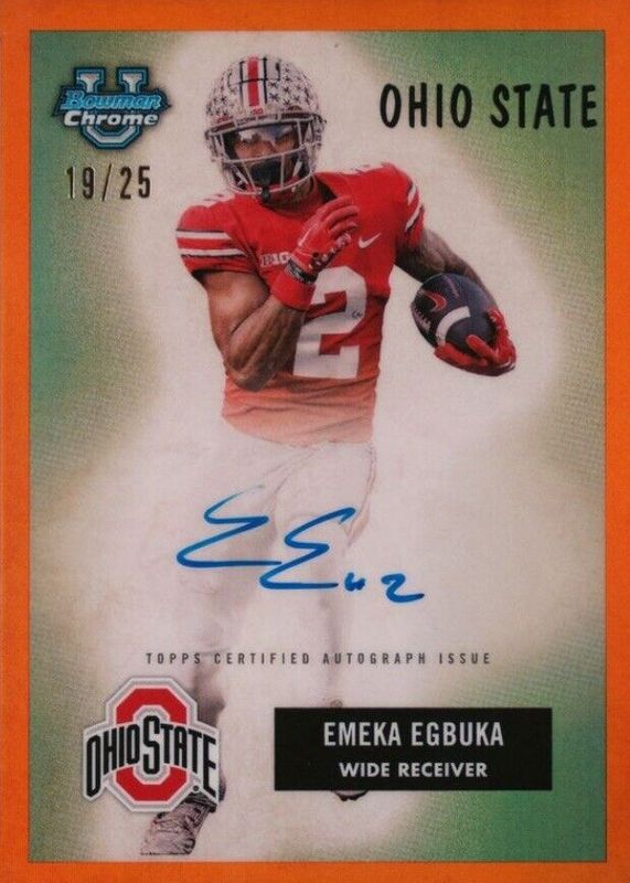 This card is 1 of 25 Emeka Egbuka's card variations in the 2023 Bowman Chrome University set being tracked by Sports Card Investor, including Prospect Auto (1st), Prospect Auto - Refractor /499 (1st), Prospect Auto - Fuchsia Mini-Diamond Refractor /150 (1st), The Big Kahuna Autographs /150, and 1955 Bowman Football Autographs /99.