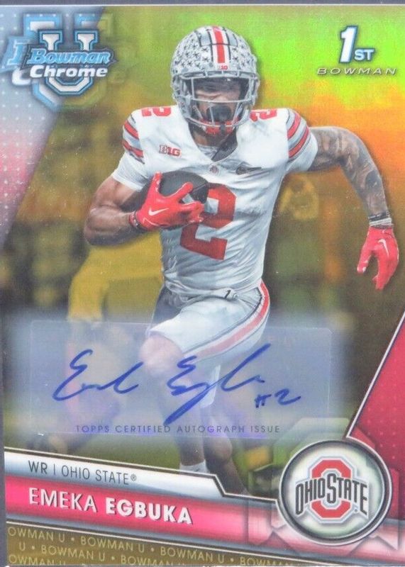 This card is 1 of 25 Emeka Egbuka's card variations in the 2023 Bowman Chrome University set being tracked by Sports Card Investor, including Prospect Auto (1st), Prospect Auto - Refractor /499 (1st), Prospect Auto - Fuchsia Mini-Diamond Refractor /150 (1st), The Big Kahuna Autographs /150, and 1955 Bowman Football Autographs /99.