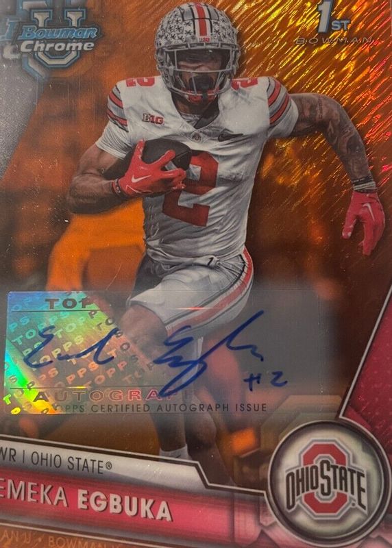 Auctions Ending Soon for Emeka Egbuka 2023 Bowman Chrome University #115 Prospect Auto - Orange Shimmer Refractor /25 (1st) RAW