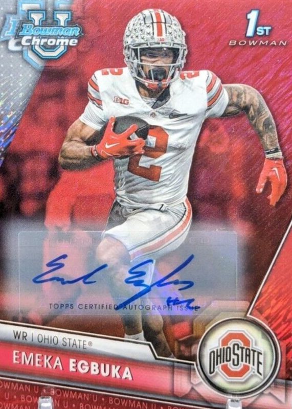 This card is 1 of 25 Emeka Egbuka's card variations in the 2023 Bowman Chrome University set being tracked by Sports Card Investor, including Prospect Auto (1st), Prospect Auto - Refractor /499 (1st), Prospect Auto - Fuchsia Mini-Diamond Refractor /150 (1st), The Big Kahuna Autographs /150, and 1955 Bowman Football Autographs /99.