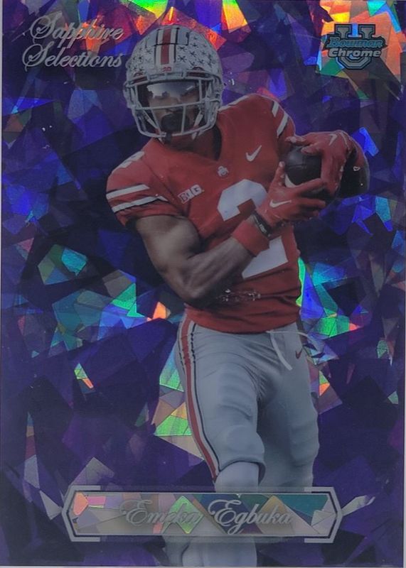 The Emeka Egbuka 2023 Bowman Chrome University Sapphire Edition #SS-13 Sapphire Selections - Purple /10 card in Raw condition has not changed in price in the last 30 days and was last sold for $38.77 .