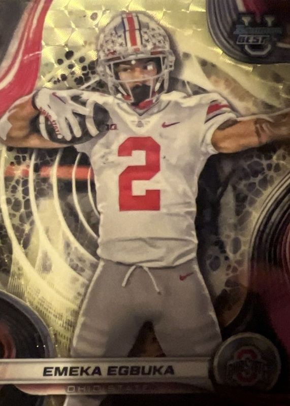 This card is 1 of 35 Emeka Egbuka's card variations in the 2024 Bowman Best University set being tracked by Sports Card Investor, including Base, Refractor, Speckle Refractor, Aqua Refractor /225, and Blue Refractor /149.