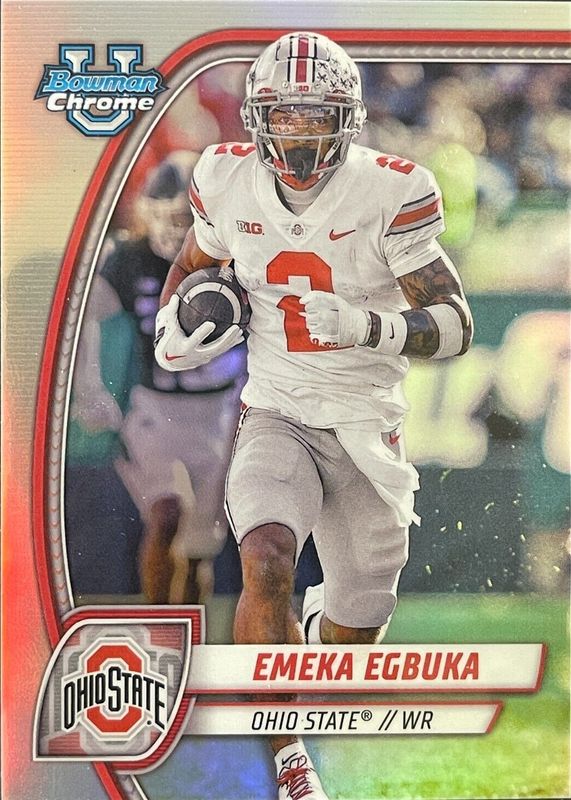 This card is 1 of 17 Emeka Egbuka's card variations in the 2024 Bowman Chrome University set being tracked by Sports Card Investor, including Prospect Auto, Prospect Auto - Stealth Refractor, Prospect Auto - Refractor /299, Prospect Auto - Fuchsia Refractor /150, and Prospect Auto - Green Refractor /99.