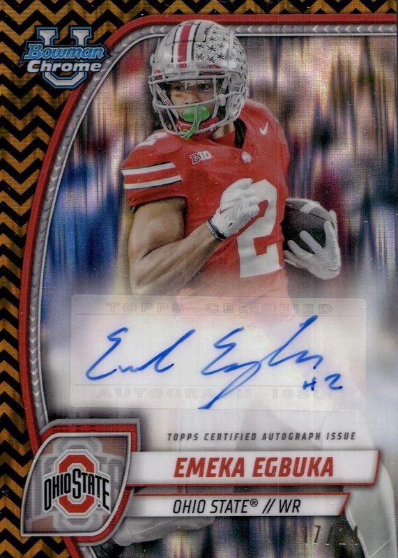 This card is 1 of 17 Emeka Egbuka's card variations in the 2024 Bowman Chrome University set being tracked by Sports Card Investor, including Image Variation, Prospect Auto, Prospect Auto - Stealth Refractor, Prospect Auto - Refractor /299, and Prospect Auto - Fuchsia Refractor /150.