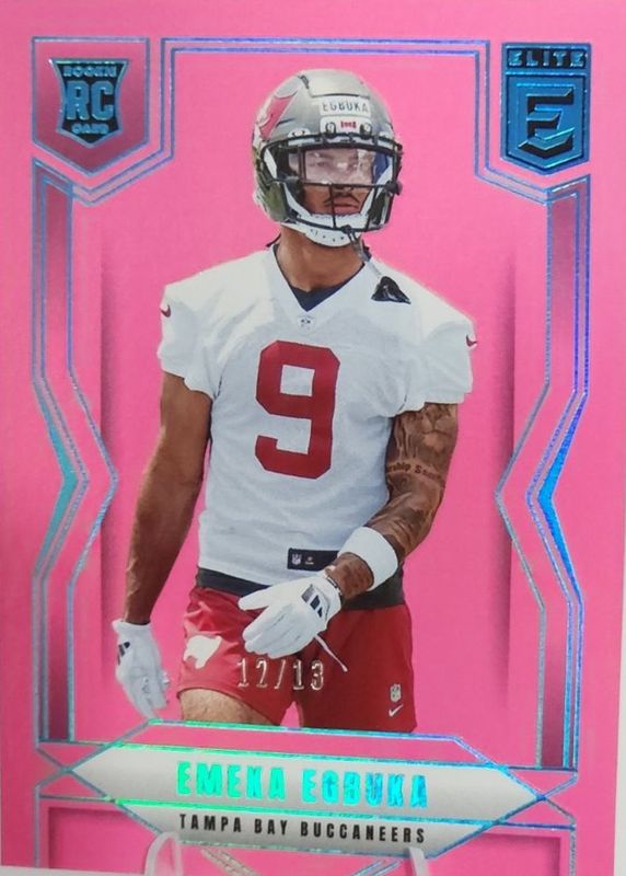 The Emeka Egbuka 2025 Elite #102 FOTL Pink /13 Rookie card in Raw condition has not changed in price in the last 30 days and was last sold for $181.50 .