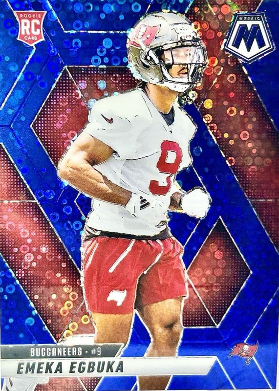 The Emeka Egbuka 2025 Mosaic #376 No Huddle Blue /99 Rookie card in Raw condition has not changed in price in the last 30 days and was last sold for $32.00 .