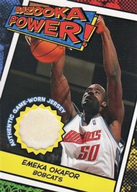 The Emeka Okafor 2005 Bazooka #BP-EO Bazooka Power! Relics card is 1 of 8 Emeka Okafor's card variations in the 2005 Bazooka set being tracked by Sports Card Investor, including Base, Gold, Minis, Blue /5, and All Star Relics.