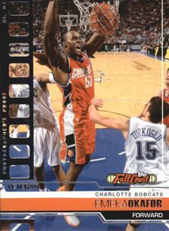 The Emeka Okafor 2006 Topps Full Court #59 Photographer's Proof /1999 card is 1 of 9 Emeka Okafor's card variations in the 2006 Topps Full Court set being tracked by Sports Card Investor, including Base /999, First Day Issue /429, Photographer's Proof Gold /199, Framed Press Plates Black /1, and Framed Press Plates Cyan /1.