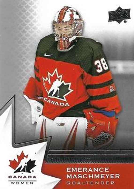 The Emerance Maschmeyer 2020 Upper Deck Team Canada Juniors #80 Base card is 1 of 25 Emerance Maschmeyer's card variations in the 2020 Upper Deck Team Canada Juniors set being tracked by Sports Card Investor, including #50 Base, #80 Exclusives /165, #50 Exclusives /165, #80 High Gloss /15, and #50 High Gloss /15.