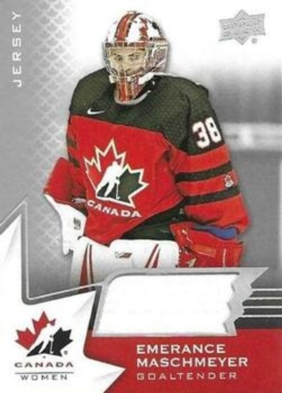 The Emerance Maschmeyer 2020 Upper Deck Team Canada Juniors #80 Jerseys card is 1 of 25 Emerance Maschmeyer's card variations in the 2020 Upper Deck Team Canada Juniors set being tracked by Sports Card Investor, including #50 Base, #80 Base, #80 Exclusives /165, #50 Exclusives /165, and #80 High Gloss /15.