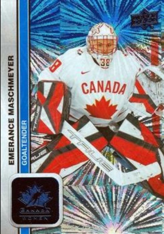 The Emerance Maschmeyer 2023 Upper Deck Team Canada Juniors #41 Patterned Foilboard Blue card is 1 of 22 Emerance Maschmeyer's card variations in the 2023 Upper Deck Team Canada Juniors set being tracked by Sports Card Investor, including Base, Clear Cut, Clear Cut Exclusives, Green, and Jerseys.
