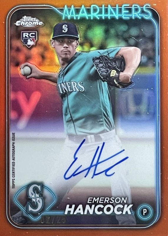 The Emerson Hancock 2024 Topps Chrome #RA-EH Rookie Autographs - Orange Refractor /25 card in Raw condition has not changed in price in the last 30 days and was last sold for $36.00 .