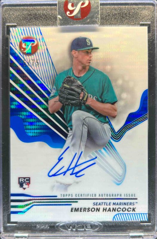 The Emerson Hancock 2024 Topps Pristine #PA-EH Pristine Autographs - Blue Pristine Refractor /75 Rookie card is 1 of 26 Emerson Hancock's card variations in the 2024 Topps Pristine set being tracked by Sports Card Investor, including Base, Pristine Refractor, Refractor, Green Refractor /150, and Pristine Purple Refractor /99.